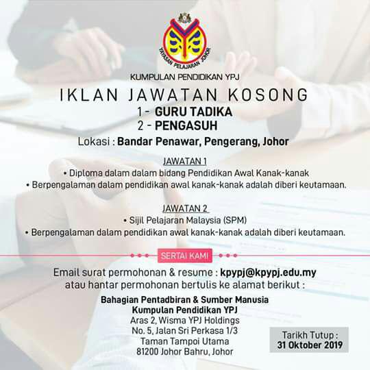 Permohonan adalah dipelawa daripada warganegara Malaysia yang berkelayakan untuk mengisi kekosongan jawatan kosong terkini di Yayasan Pelajaran Johor (YPJ) sebagai: